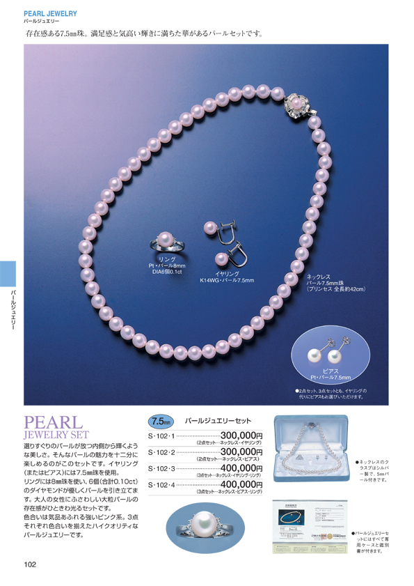 P.0 表紙 P.1 目次(目次一覧↓) ジュエリー イン ファッション ■ Pt スリーストーン ペンダントチェーン ■ K18WG スリーストーン ペンダントチェーン ■ レーザーホールダイヤモンド ペンダントチェーン ■ ダイヤモンドハイジュエリー ■ ジュエリーインファッション ■ ヘルシー&ラッキージュエリー ■ ジュエリー イン ファッション ■ ペア&ポージー ■ ブライダルジュエリー ■ ダイヤモンドデザインリング ■ カラーストーンデザインリング ■ デザインリング ■ カラーストーンジュエリー ■ パールジュエリー P.86 パールジュエリー P.87 パールペンダントチェーン P.88 カラー淡水パールジュエリー P.89 パールピアス&イヤリング P.90 K18パールジュエリー P.91 K18パールジュエリー P.92 マベパールジュエリー P.93 マベパールジュエリー P.94 パールブローチ P.95 パールブローチ P.96 黒蝶真珠ジュエリー P.97 黒蝶真珠ブローチ P.98 花珠パールジュエリー2点セット P.99 グレーパールセット P.100 パールジュエリーセット P.101 パールジュエリーセット P.102 パール ジュエリーセット P.103 パールジュエリーセット P.104 「留花(ルカ)」パールセット P.105 「留花(ルカ)」グレーパールセット ■ ピアス ■ イヤリング ■ ブローチ ■ ネックレス&ブレスレット ■ メンズジュエリー
