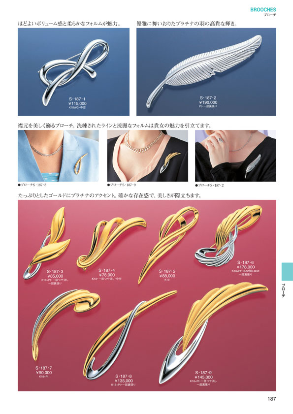 P.0 表紙 P.1 目次(目次一覧↓) ジュエリー イン ファッション ■ Pt スリーストーン ペンダントチェーン ■ K18WG スリーストーン ペンダントチェーン ■ レーザーホールダイヤモンド ペンダントチェーン ■ ダイヤモンドハイジュエリー ■ ジュエリーインファッション ■ ヘルシー&ラッキージュエリー ■ ジュエリー イン ファッション ■ ペア&ポージー ■ ブライダルジュエリー ■ ダイヤモンドデザインリング ■ カラーストーンデザインリング ■ デザインリング ■ カラーストーンジュエリー ■ パールジュエリー ■ ピアス ■ イヤリング ■ ブローチ P.180 カメオ P.181 カメオ P.182 平戸 P.183 平戸 パール スリーカラー P.184 カラーストーン・ダイヤモンド P.185 アニマル P.186 デザインブローチ P.187 デザインブローチ P.188 ミニブローチ 蝶 P.189 ピンブローチ イニシャル ■ ネックレス&ブレスレット ■ メンズジュエリー